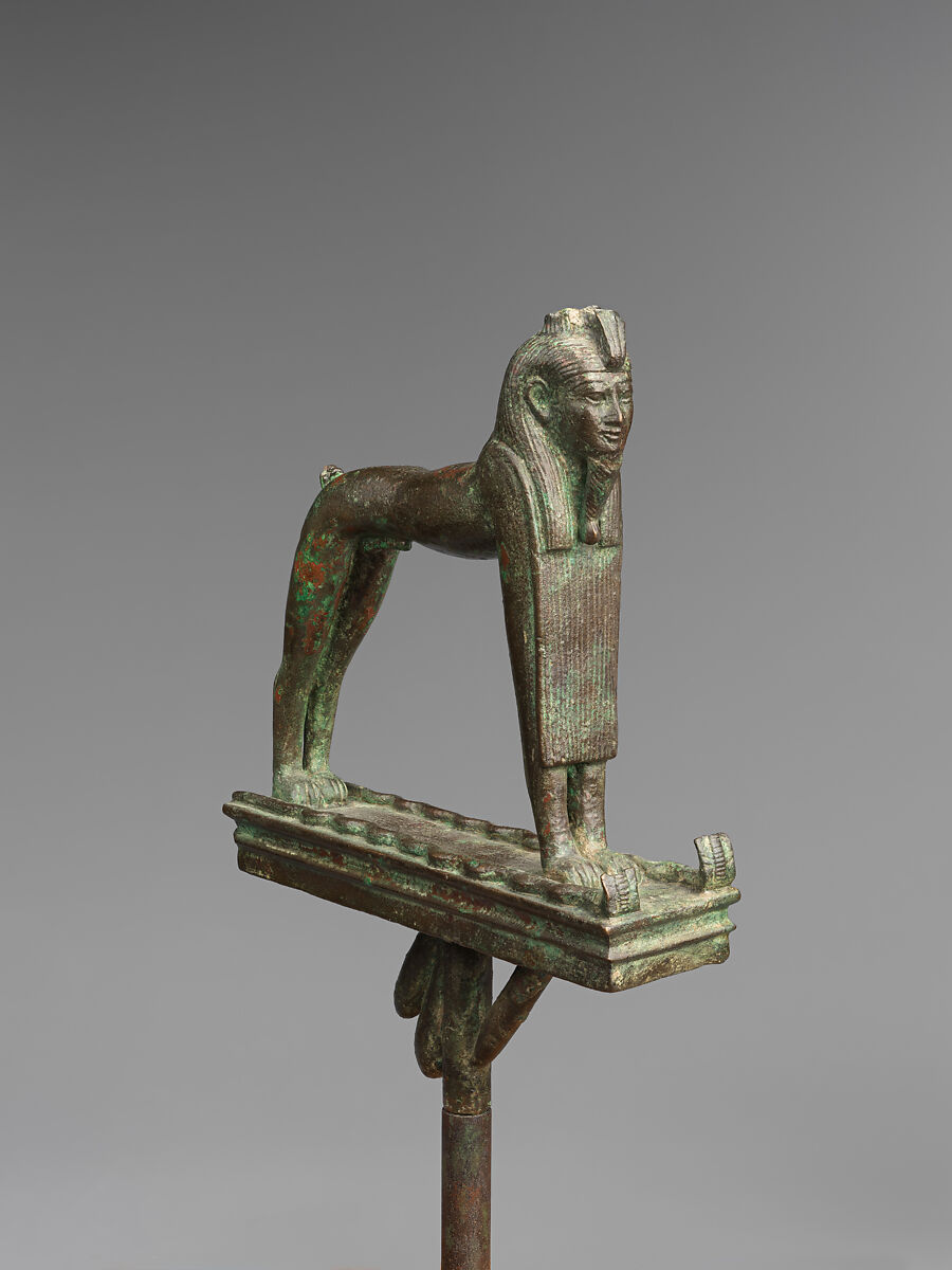 The barque sphinx is a standard, that is to say it appears on a platform meant to be raised on a pole. Two cobras, heads broken, undulate alongside the animal on the platform, reinforcing the dangerous power of the sib. The sphinx itself is a composite of human and lion, the identity of the latter clearly indicated by the long striated mane depicted on the animal's chest. But this very beautiful example with elongated body, extremely slim and high hips and backward thrusting legs probably alludes to the dangerous grace of leopards and panthers, who are associated with the solar barque voyage, and also recalls the jackal standard.