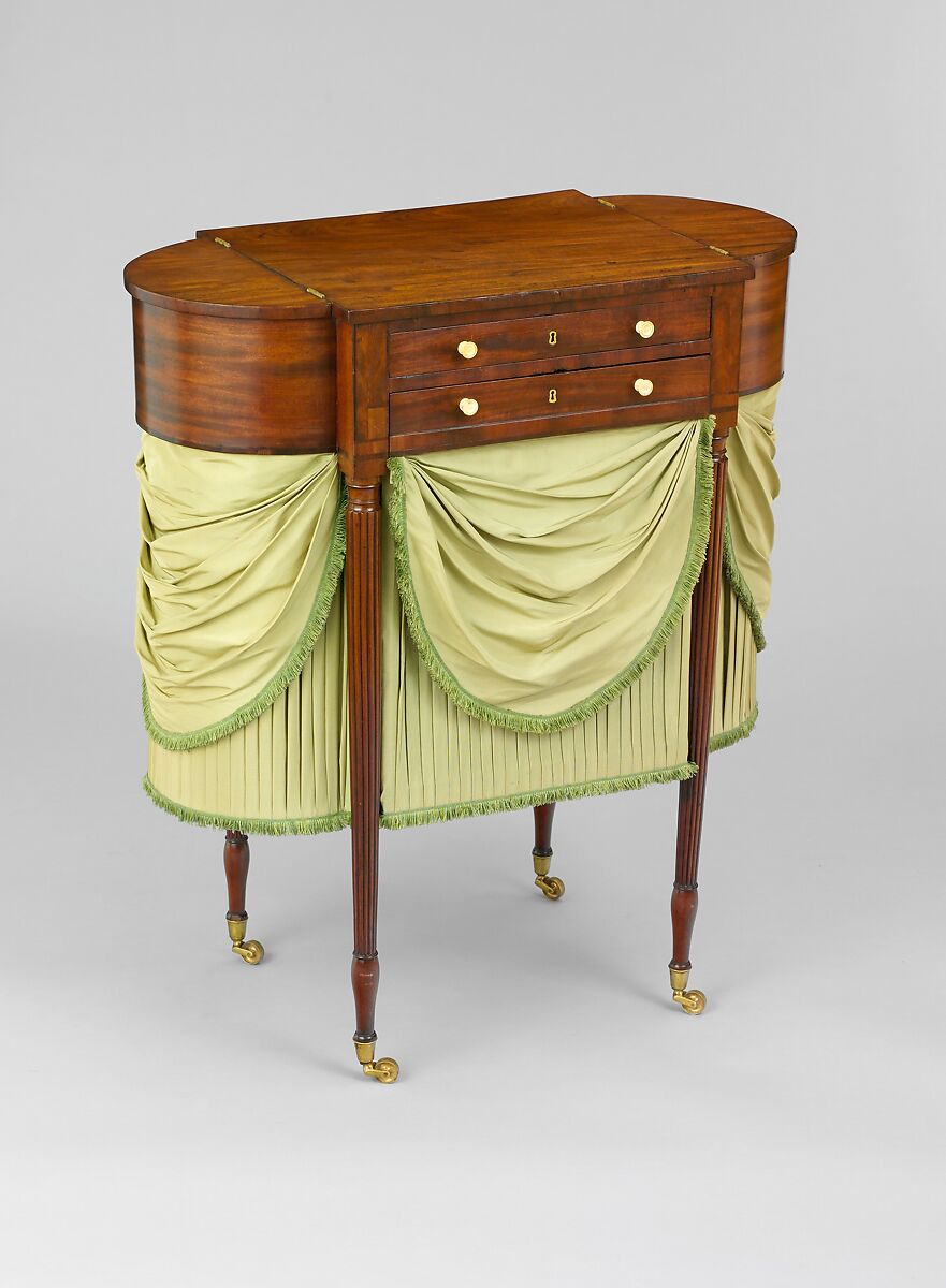 This astragal-end ladies sewing or worktable is distinguished by its tall, elegant, and finely reeded legs. The pleated silk bag, which held sewing fabric or needlework, is patterned after a design in plate 26 of Thomas Sheraton’s "The Cabinet- Maker and Upholsterer’s Drawing-Book" (1794).