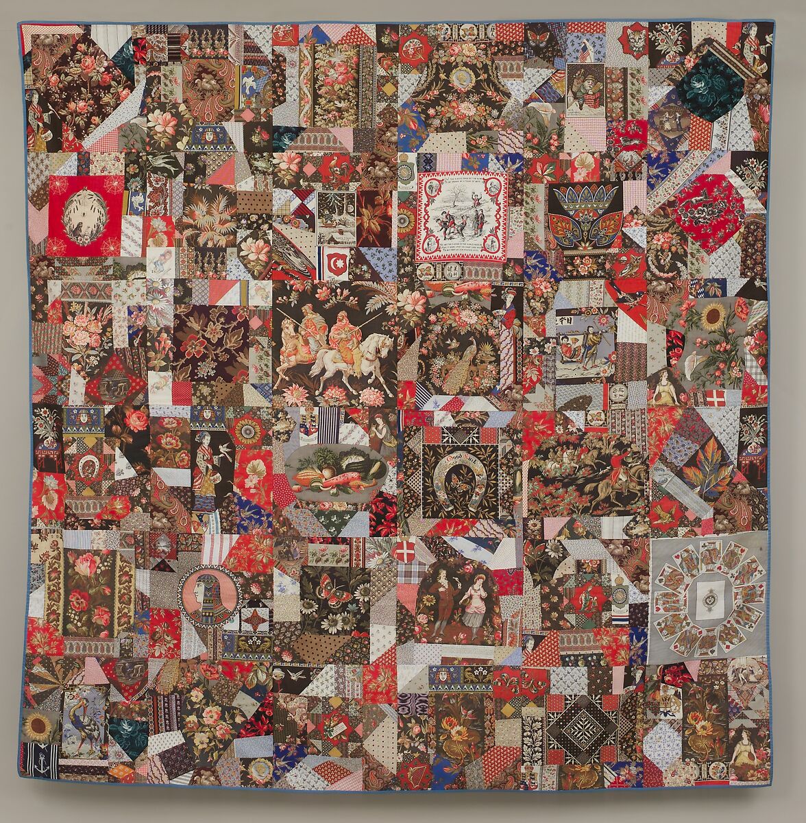 Crazy quilts, a fad in the last decades of the nineteenth century, were most commonly pieced from irregularly shaped bits of velvet and silk. This exuberant quilt is far more unusual, since its unknown maker chose to craft it from brightly patterned cottons. The cottons create an album of fashionable, though inexpensive, fabrics of the 1880s, including Egyptian Revival and Japanesque designs, children’s handkerchiefs, and pieces of “cheater” cloth—fabric that was printed to imitate patchwork. One of the handkerchiefs, printed with playing cards, is inscribed “ORIENTAL PRINT WORKS, APPONAUG, RI.” It is possible that this mill produced many of the fabrics found in the quilt.