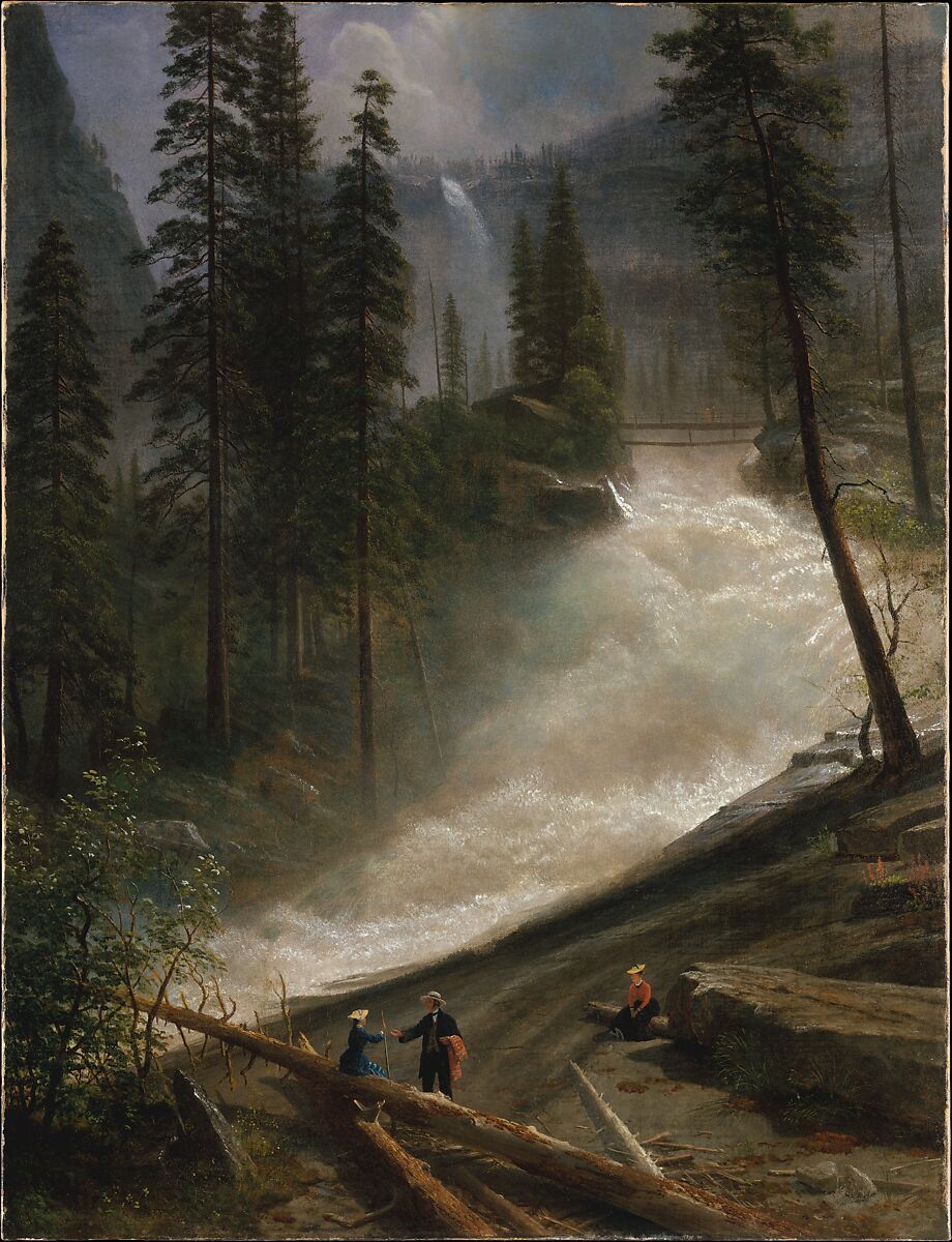 At Nevada Falls in California’s Yosemite Valley, the Merced River plunges over a high ledge onto a jumble of boulders almost six hundred feet below, creating a torrent of white water and plumes of spray. Tourists were able to visit Nevada Falls by climbing a rocky trail that rose 1,840 feet in elevation from Vernal Falls, a mile and a half downstream. Bierstadt signals this possibility by portraying several sightseers, among them two women in hiking gear.