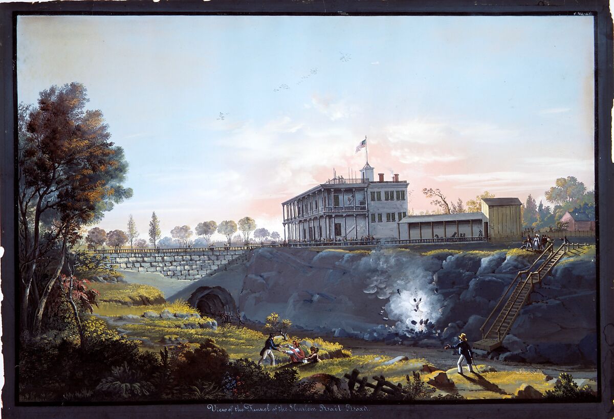 Calyo’s decided taste for fires and explosions is evidenced not only by his images of the Great Fire in New York (1835), but by numerous gouaches he made of Mount Vesuvius erupting above his native Naples. In this view documenting the progress of urbanization into northern Manhattan, he depicts an explosion that has just occurred in the ravine below the Prospect Hotel, which sat on the hill above the entrance to the Yorkville railroad tunnel on Fourth Avenue (now Park) between Eighty-eight and Ninety-fifth Streets. Calyo probably contrived the incident; however, it may be that the herculean task of digging and blasting the tunnel to completion had become something of a public attraction, witnessed here by the crowd at the railing beneath the hotel.
