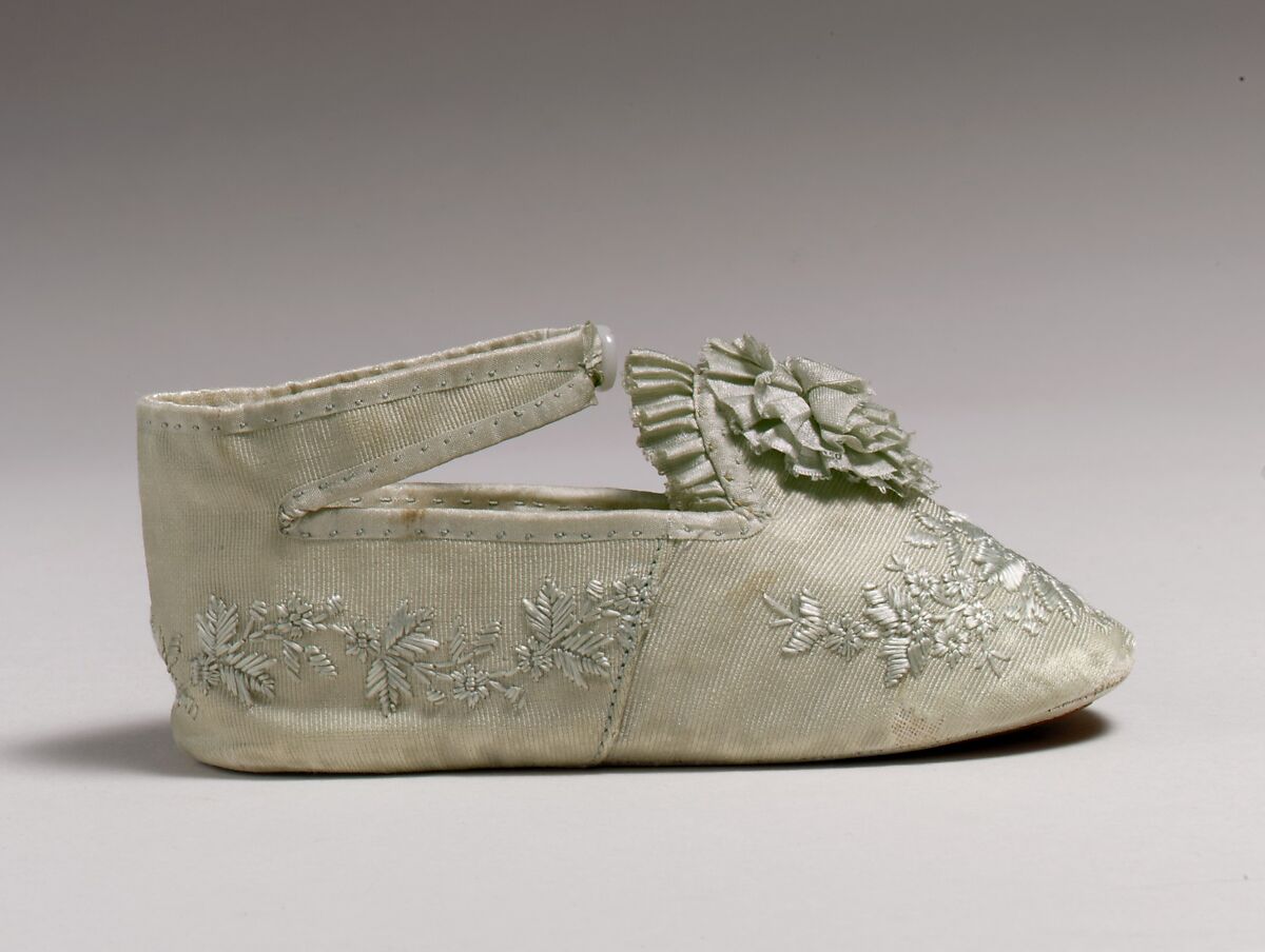 Like that of their parents, children's footwear in the nineteenth century could be lavishly ornamented, as this elegant pair of booties attests. Throughout the century, wealthy children were dressed in smaller versions of the garments worn by adults, although practical clothing for play came into vogue at the beginning of the twentieth century. These leather-soled booties were intended for a slightly older child and most likely made by a professional, but knitted or hand-sewn booties were also a common part of an infant's layette in the nineteenth century.