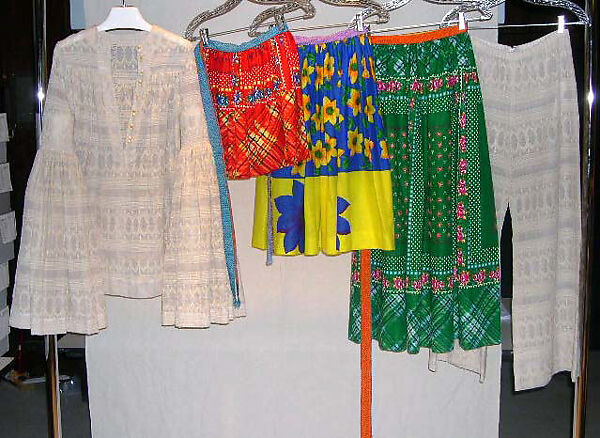 Giorgio di Sant’Angelo began his career in fashion with designs for plastic jewelry in the late 1960s. Early examples were featured in Vogue magazine under editor, Diana Vreeland and earned Sant’Angelo a Coty Award in 1968. His first clothing collections were inspired by traditional Romany and Native American dress and reflected the multicultural and do-it-yourself aesthetics of the hippie movement. The designs, which rejected the strictly tailored forms of the previous decade, featured natural silhouettes achieved through wrapping, layering, and tying fabric around the body. They earned the designer his second Coty Award in 1970. Sant’Angelo’s popularity waned along with the mode for eclecticism and fantasy in the early 1980s. He returned to favor in the late 80s with designs for wrapped, body conscious garments in brightly-colored silk stretch gauze. He won his second clothing award for his use of stretch fabrics from the Council of Fashion Designers of America in 1988, shortly before his death in 1989.