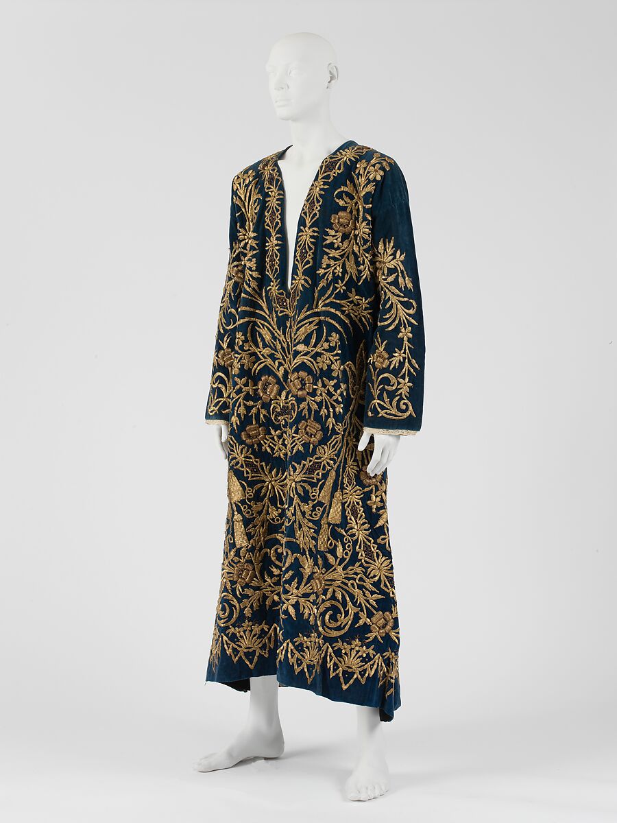 This bindalli (bindallı in Turkish) dress stands apart from others in the collection because of its deep, plunging neckline. In other ways the dress, which is made of a blue silk velvet, is typical of this group of garments in its shape, construction, and beautifully executed gold dival embroidery. Examination of the dress shows that the neckline was altered after it was made by folding the edges of the front opening to the inside of the garment, thus creating a deeper and wider front opening. As a revealing neckline such as that would not have been acceptable in the Ottoman context, it seems likely that the change was made after the dress reached the United States in the early 1920s, perhaps to allow the garment to be worn as an evening dress. In its original context, the dress would have been worn for weddings and other special occasions by Muslim and Jewish women in Anatolia and Balkans.
