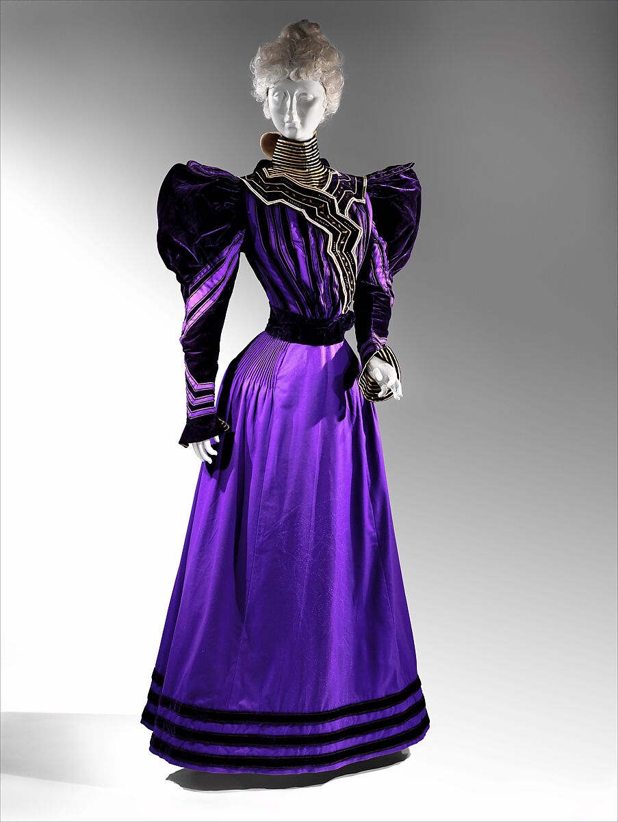 This half-mourning dress of vivid purple accented with boldly arranged black and white trimming, exhibits the full gigot sleeve that defined mid-1890s fashions. The ensemble was purchased from James McCreery & Co., a New York department store that maintained a mourning-goods section that offered textiles as well as made-to-order and ready-made garments. The availability of an expanding range of ready-made goods for women was facilitated by the invention of the sewing machine, increasing standardization of dress patterns, and the rise of department stores that capitalized on these innovations. Fashion magazines often cited well-known retailers of mourning goods, including McCreery, as sources of information on current mourning styles and standards of etiquette.