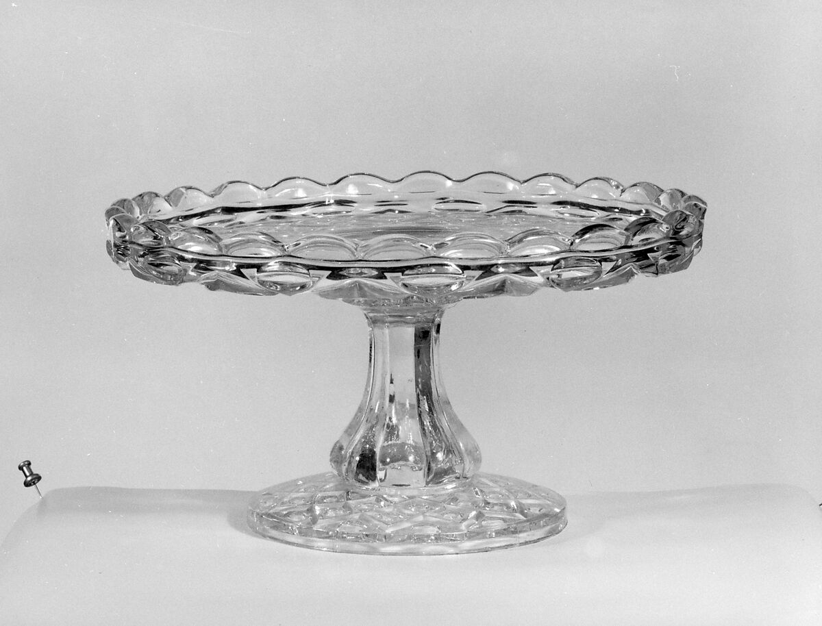 With the development of new formulas and techniques, glass-pressing technology had improved markedly by the late 1840s. By this time, pressed tablewares were being produced in large matching sets and innumerable forms. During the mid-1850s, colorless glass and simple geometric patterns dominated. Catering to the demand for moderately-priced dining wares, the glass industry in the United States expanded widely, and numerous factories supplied less expensive pressed glassware to the growing market. At the Exhibition of the Industry of All Nations at New York’s Crystal Palace in 1853, for example, the New England Glass Company exhibited 130 pieces of one design, "consisting of bowls, tumblers, champagnes, wines, and jelly glasses." This object belongs to one such service. Although the glass manufactory is not known, the glassware is very typical of the large services that were very popular with America’s middle class in the nineteenth century.