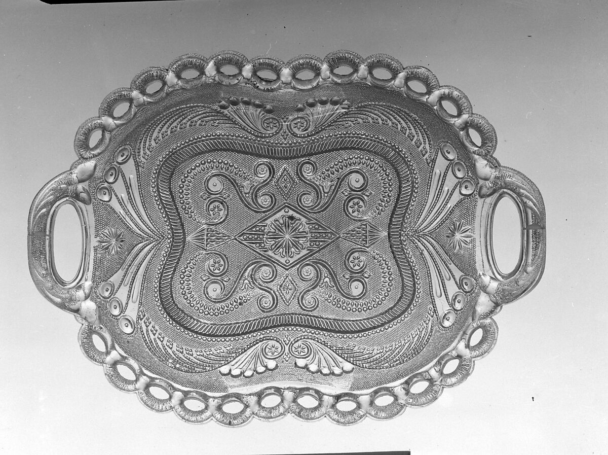 This tray, with its open chain rim and open handles, represents a technical achievement in pressing and mold making. Because trays of this design are fragile, they are rarely found in good condition.