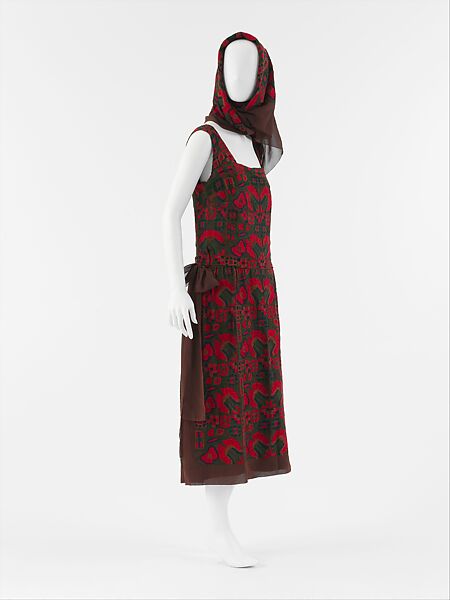 This afternoon ensemble from Chanel's "Russian" collection of 1922 champions a Kitmir cornély, or chain-stitched machine embroidery, in a folkloric pattern across the entirety of the garment, which appears as well on the center square of a matching "babushka" scarf. The sheath bears the rare original "Gabrielle Chanel" label, later reduced to the couturière's last name in a large, sans-serif type consistent with the designer’s emerging modernist aesthetic.