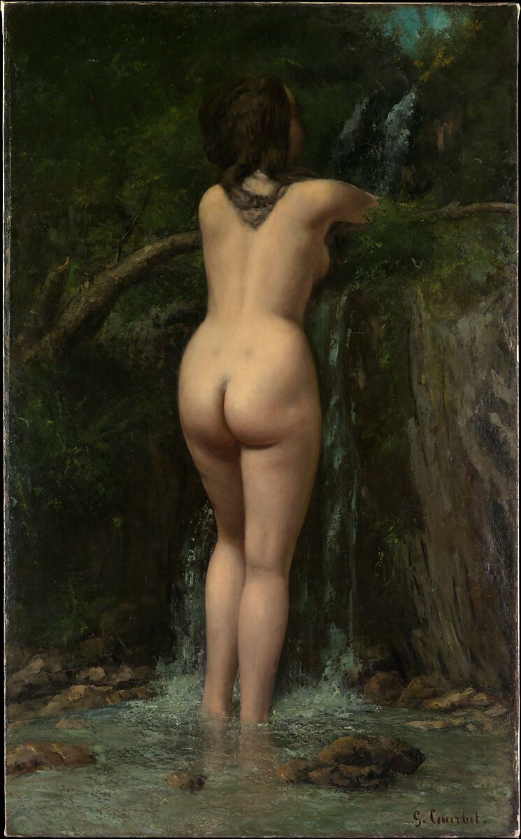 Rejecting the convention of showing an idealized, statuesque female figure based on classical models, in this work Courbet dropped the trappings of an academic allegory or, indeed, of a picture with a high-minded pretext. His picture of a woman embracing a cascade of water may have been a response to a work by Ingres exhibited in Paris the previous year, which depicts a hyper-idealized nude holding a jar from which water pours as an allusion to spring or a river source.