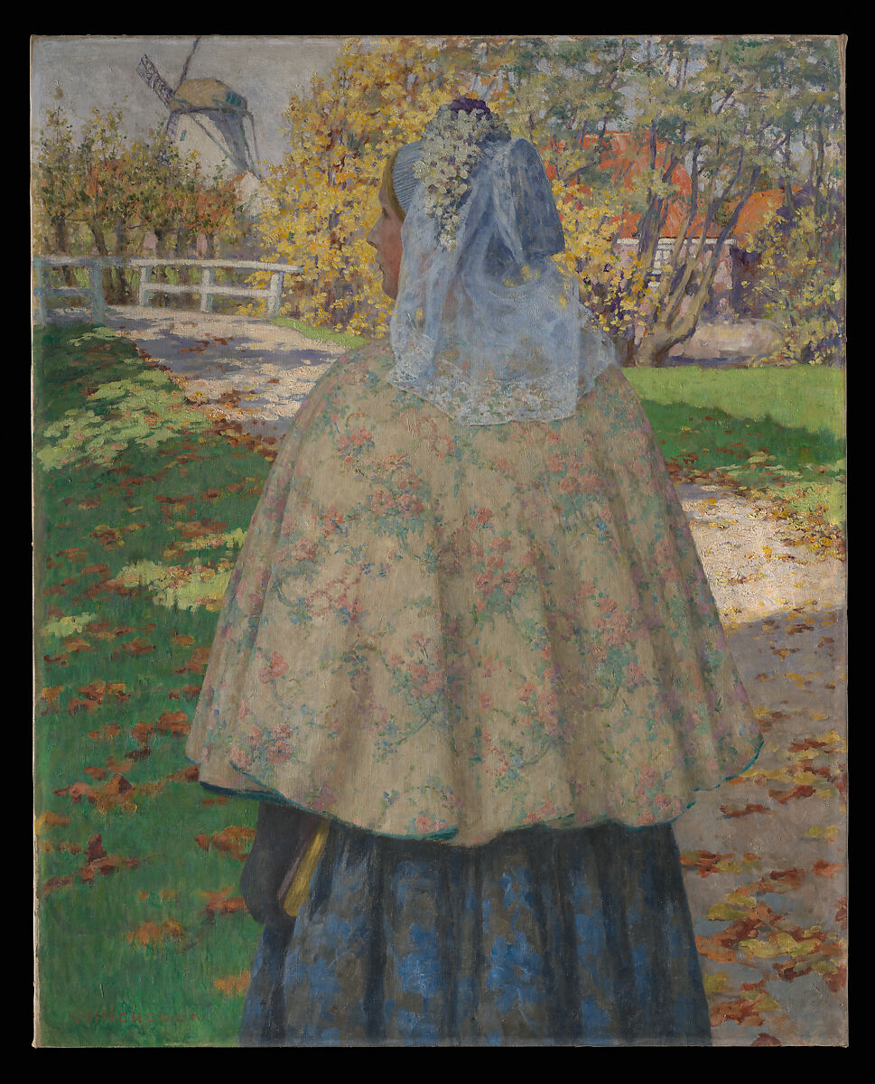 In reaction to the industrialism and materialism of the modern age, a religious revival about 1900 reflected a general spiritual yearning among artists and their patrons. This painting shows a young Dutch woman walking to evening prayers, or vespers. She wears the typical Zeeland circular, colorful cape and white, transparent headdress that resembles a bridal veil. The religious subject and the detailed rendering of landscape and costume reveal the expatriate Hitchcock's strong dependence on French painters such as Jules Bastien-Lepage. Hitchcock's assimilation of Impressionism is revealed in the unconventional composition, interest in pattern, and intense palette.