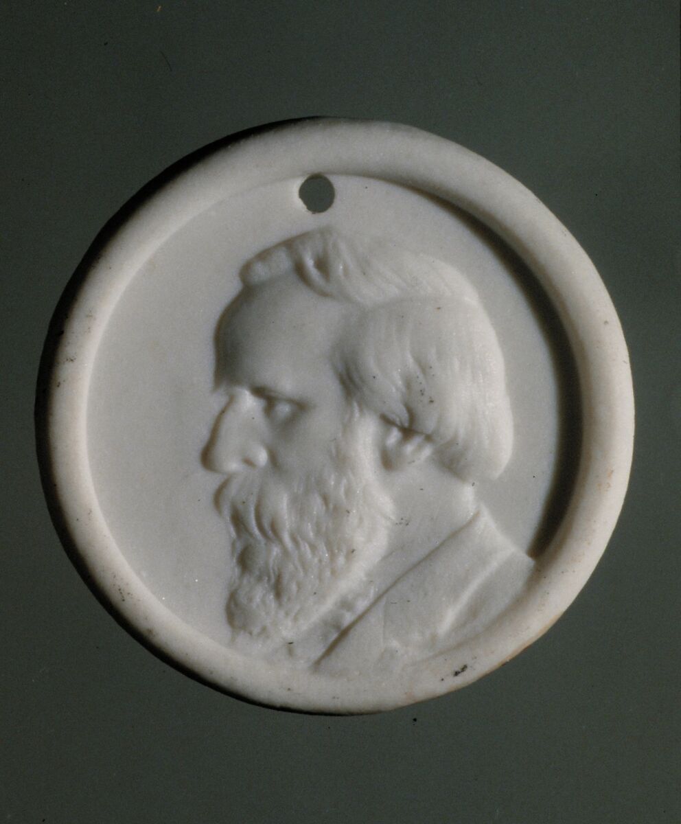 This biscuit porcelain medallion includes a relief with the profile of the 1876 presidential candidate, Rutherford B. Hayes. The medallion was possibly made for use either as a campaign button or for distribution at the Philadelphia Centennial.