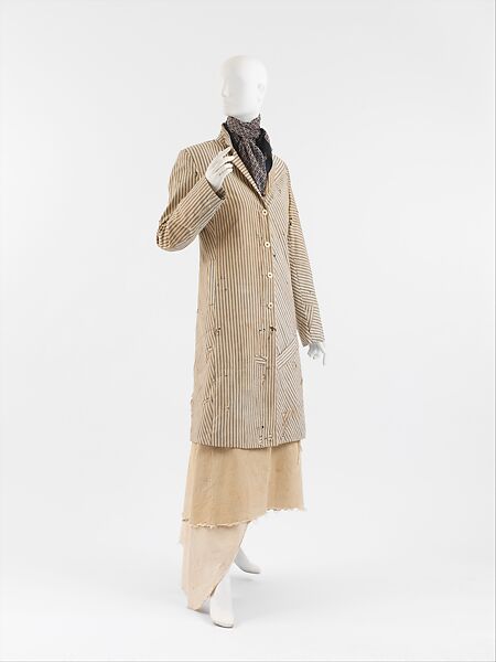 This design from Miguel Androver's second collection was described by Cathy Horyn of the New York Times as "a simple but respectable Sunday-going-to-church outfit out of a Willa Cather story." Its faded, dusty colors and worn surface made Horyn's reference especially apt. However, the ensemble took on other evocative connotations-either macabre or poignant, depending on one's point of view-when Adrover noted that the fabric was taken from the discarded mattress of the late Quentin Crisp. The designer's salvaging of this piece of urban detritus, with its forlorn history of wear and rusty stains, and transforming it into a tailored coat was less recycling than poetic reinvention. Like Martin Margiela, Adrover incorporates the Dadaist strategy of unexpected recontextualizations. In this instance, a classically tailored coat is invested with the resonance of a very public person's intensely personal history.