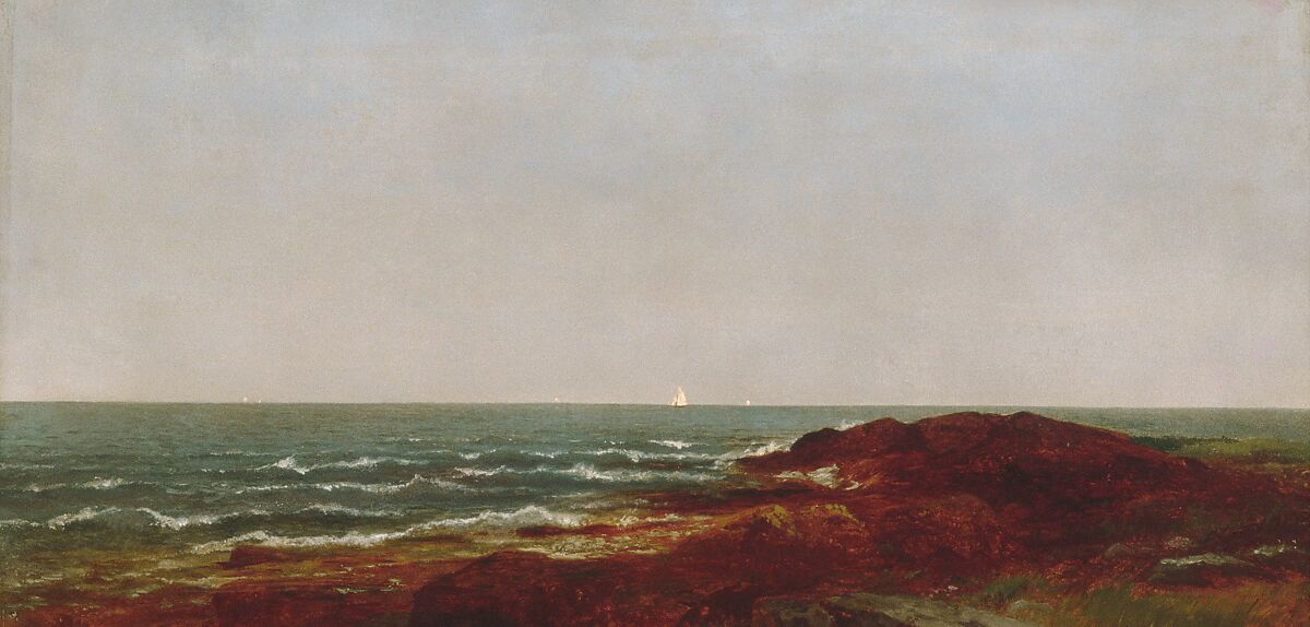 This contemplative seascape likely depicts the Long Island Sound from Contentment Island, Darien, Connecticut, where Kensett lived and worked from 1867 until his death in 1872. In this boldly simplified composition, the artist distilled nature to its most essential elements—land, sea, and sky—the last covering two-thirds of the canvas. Small sailboats dot the horizon, creating the illusion of depth and emphasizing the limitlessness of the ocean. Such views were widely popular with urban collectors, who often sought out meditative idealizations of nature as antidotes to fast-paced city life.