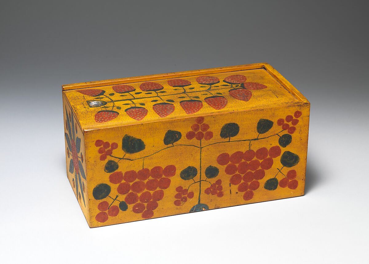 A superb example of painted decoration, the design of grapes and strawberries on this candle box is reduced to bold geometric shapes in symmetrical arrangement. The striking effect of the pattern is enhanced by the decorator's choice of a palette restricted to vivid red and green on a bright yellow ground.