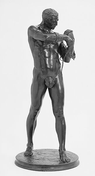 The Munich-trained Niehaus modeled Caestus in Rome, combining the inspiration of ancient sculpture with his penchant for anatomical realism. The work depicts a rigidly posed athlete preparing for a fight by binding leather straps in a crisscross pattern around his forearms. This arrangement of straps, known as a caestus, was the ancient Roman equivalent of the modern day boxing glove. Lead or iron weights were often secured over the knuckles to increase the impact of the blows.