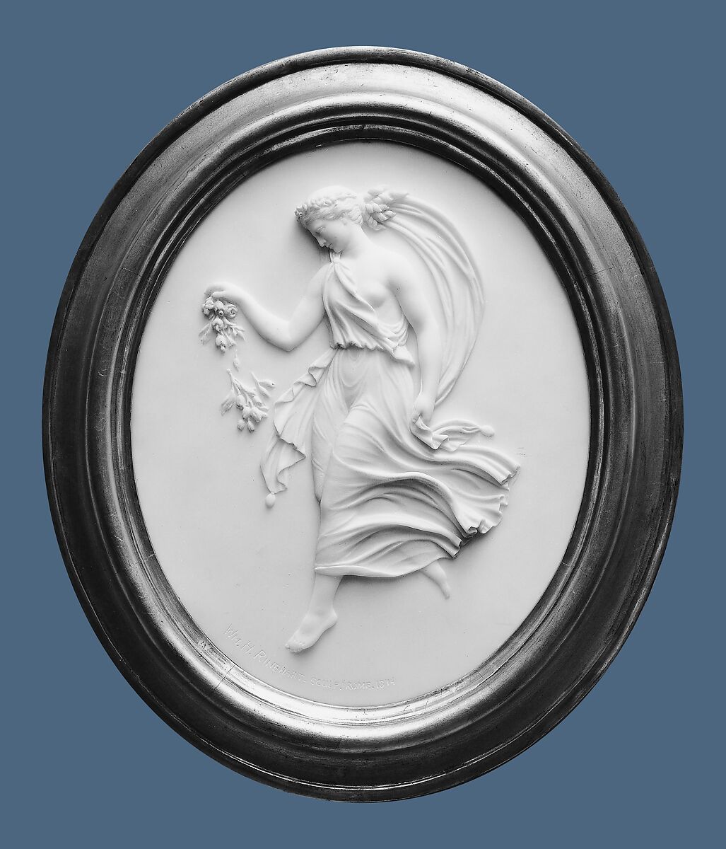 "Spring" and its pendant, "Winter," were among the earliest works Rinehart created after moving to Italy in 1855. Personifications of the seasons and the times of day were frequent themes in Neoclassical relief sculpture. This work is reminiscent of the popular reliefs by the Danish sculptor Bertel Thorvaldsen, especially his "Day and Night" (1815; Thorvaldsens Museum, Copenhagen). Only the oval shape is a departure, since most Neoclassical reliefs are circular. Rinehart's bas-relief depicts a young woman as the personification of Spring, with classicized facial features and hair treatment. Her flowing drapery, revealing one breast in the manner of antique sculptures of Amazons, closely outlines her elongated form. She scatters flowers, her symbol.