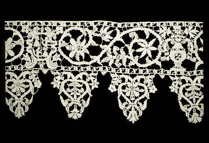 Punto in aria—literally, "stitches in the air"—is one of the earliest styles of needle lace, which is itself developed from cutwork of primarily geometric design. When lacemakers transitioned to using a foundation of threads laid out according to a pattern drawn on parchment, they were able to incorporate more fluid lines and curves into their designs.