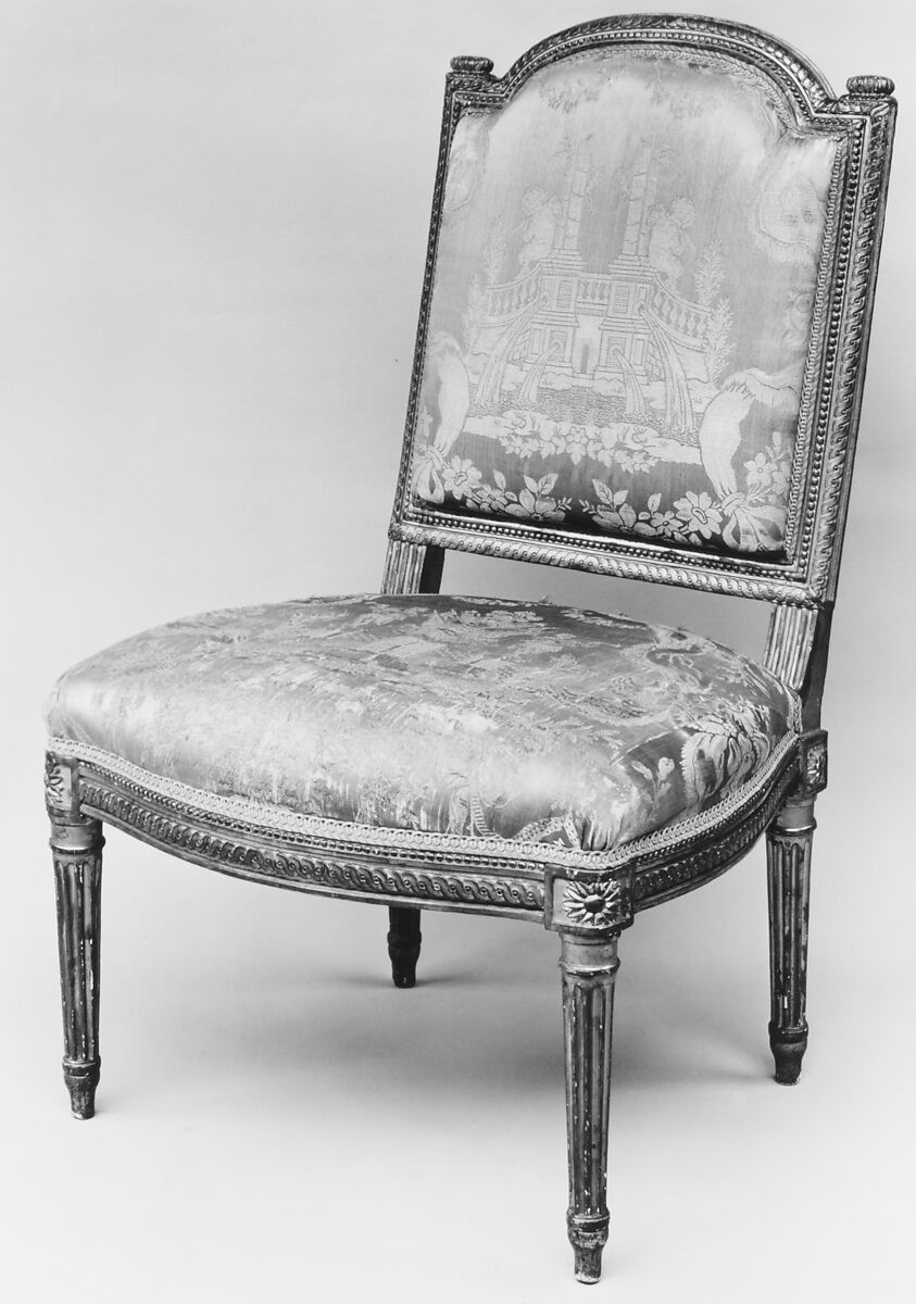 The various memoires documenting the creation of the seat furniture illustrate the typical eighteenth-century division of labor in such projects. The menuisier Boulard, who received many commissions from the court, cut the wood for the chairs with their arched top rail and slightly curving seat rails and assembled them. The decorative carving, consisting of guilloche and pearl motifs matching the ornament of the door cases in the king's Salon des Jeux, was done under the direction of Jean Haure by the sculptors Nicolas-Francois Vallois and Lambert Charny, who were responsible for, respectively, twenty-four and twelve chairs each. Three different gilders were called upon to finish the frames, and the upholsterer Claude-Francois Capin (d. 1789) covered the set in blue, white, and gray lampas with an arabesque design woven for this purpose by the firm of Louis Reboul, Fontebrune et Cie in Lyons. The seat rails of the Museum's chairs are slightly lower than those on some of the other side chairs of this suite, indicating that they were among the twelve intended to have a removable seat cushion.