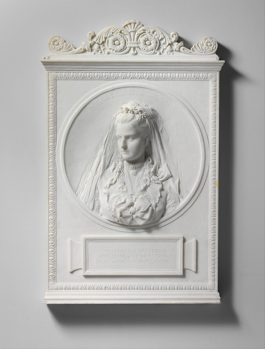 In 1893 the New York lawyer Charles W. Gould commissioned Saint-Gaudens to complete a portrait of his late wife, Louise Adele Dickerson Gould (b. 1856), who died in 1883 at age twenty-six, after less than three years of marriage. Using photographs for reference, the sculptor modeled the demure Louise Gould as she appeared in fashionable bridal finery on her wedding day, St. Agnes Eve, January 20, 1881. The reference to St. Agnes, who is associated with purity and martyrdom, accentuates the melancholy of the sculpture. So too does its rectangular shape, which is evocative of a tombstone capped with an ornamental crest of acanthus scrolls, and the inscription on the lower portion of the panel: she seemed a splendid angel newly dressed save wings for heaven.