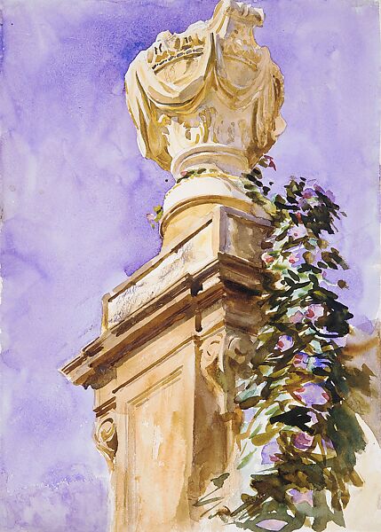 An inscription on the back of this striking watercolor suggests that it was painted near Lucca, a charming Renaissance walled city in Tuscany, where Sargent spent the autumn of 1910. At the time, Sargent was preoccupied with creating a series of vibrant watercolors of villas and their gardens, which often focused on the effect of Italian light against stone. Here, Sargent uses a low vantage point to set off the richly carved urn against a brilliant blue sky, which he created with broad, wet washes. He enlivens a static subject by placing the urn close to the top edge of the composition and depicting the vine of vivid pinkish blue blossoms (possibly convolvulus, part of the morning glory family) as if it is cascading from the urn, using feathery brushstrokes.