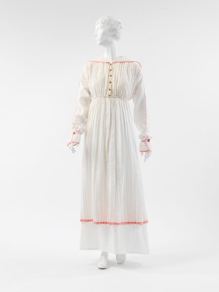 Two related dresses, ‘La Rosière’ (virtuous young girl) and 'Le Butard' (after Poiret's retreat, the Pavillon de Butard in La Celle-Saint-Cloud), are from the spring collections of 1911 and 1912, respectively. Inspired by Directoire gowns, they also relate to the Romantic styles of the 1810s-20s. Rather than the deliberate classicizing details of the Directoire and Empire, however, the dresses allude to the Arcadian rusticity of the period. As in many of Poiret's designs, a color or motif, here a binding of pink bias tape, introduced in one season is elaborated on in a later collection.