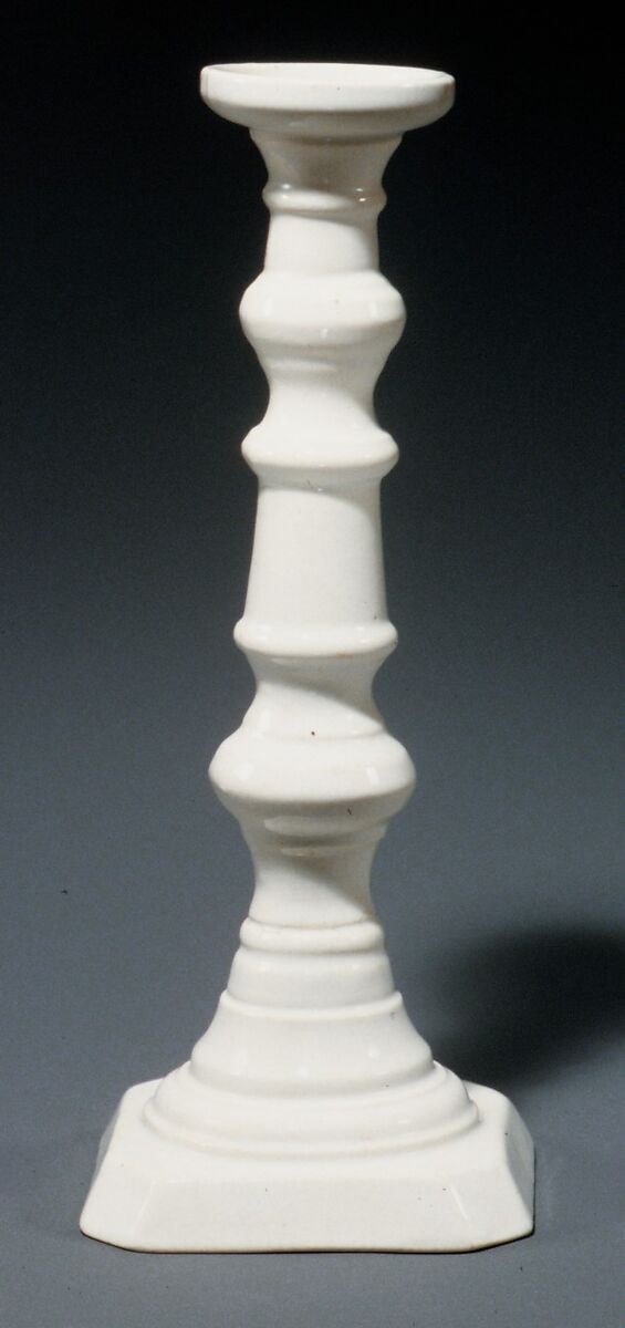 This white porcelain candlestick, with a clear lead glaze, is an example of the type of porcelain being produced in Gloucester, New Jersey, and Greenpoint, New York, during the mid nineteenth century, and emulates similar forms being produced in metal.