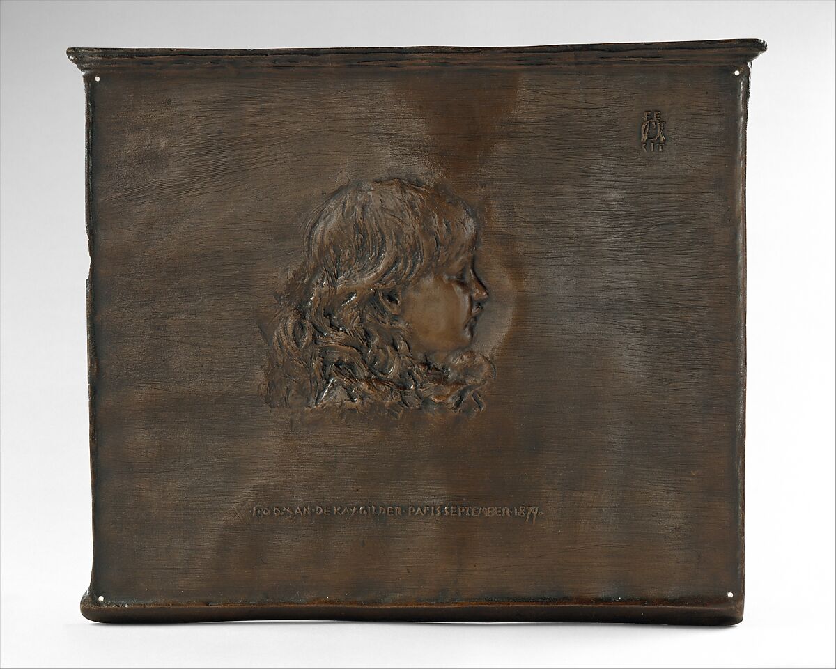 In one of Saint-Gaudens’s earliest representations of a child, the cherubic head of Rodman de Kay Gilder (1877-1953) floats on a field of bronze. The sculptor excerpted this head study from a portrait of the Gilder family completed several months earlier (2002.445). His love of technical experimentation is evident in the scumbled treatment of hair and clothing, resembling thickly applied paint; the wispy horizontal striations of the background, recalling etching; and the cornice-like architectural element above. Saint-Gaudens was particularly pleased by the quality of this bronze, which he cast in New York soon after returning from Paris.