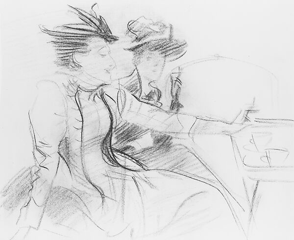 Though friends described Sargent as shy and retiring, he was also very social and went out nearly every night. This informal sketch probably shows his childhood friend Flora Priestley (1859–1944) with an unidentified woman. The table and loosely drawn cups, represented by a few quick lines, suggest that the setting is a café. The relaxed and confident poses of the two elegantly attired figures seated on a banquette may imply that they are "new women" who are not concerned with breeching decorum by smoking in public.