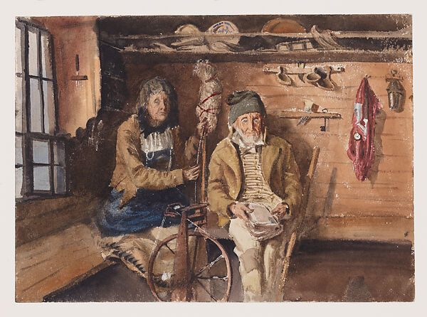 Sargent made several careful portrait studies at Mürren (50.130.146z verso and 50.130.146bb verso). Frau von Allmen appears with an accompanying inscription in 50.130.146oo verso. Here she is shown with an aged man in a highly detailed and meticulously rendered interior.