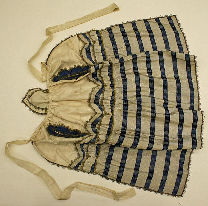 Elaborate aprons in silks and metallic fabrics of the seventeenth century continued to be worn as luxurious accessories in the succeeding century. These aprons served no practical purpose; rather, they added variety to a fashionable woman’s wardrobe by altering the lines and colors of her costume.