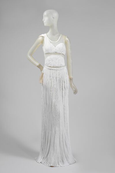 With this design, Lang combines references to two precipitating strands of the early modern movement-primitivism and classicism. Other designers, from Alix Grès to Azzedine Alaia, have paired tribal and Greco-Roman details in one ensemble, but Lang's conflation literally layers, rather than merges, his evocation of sources with Hellenic and African effect. In a typical expression of his "raw and cooked" methodology, the designer juxtaposed coarse natural horsehair with finely pleated silk organza and silk chiffon.