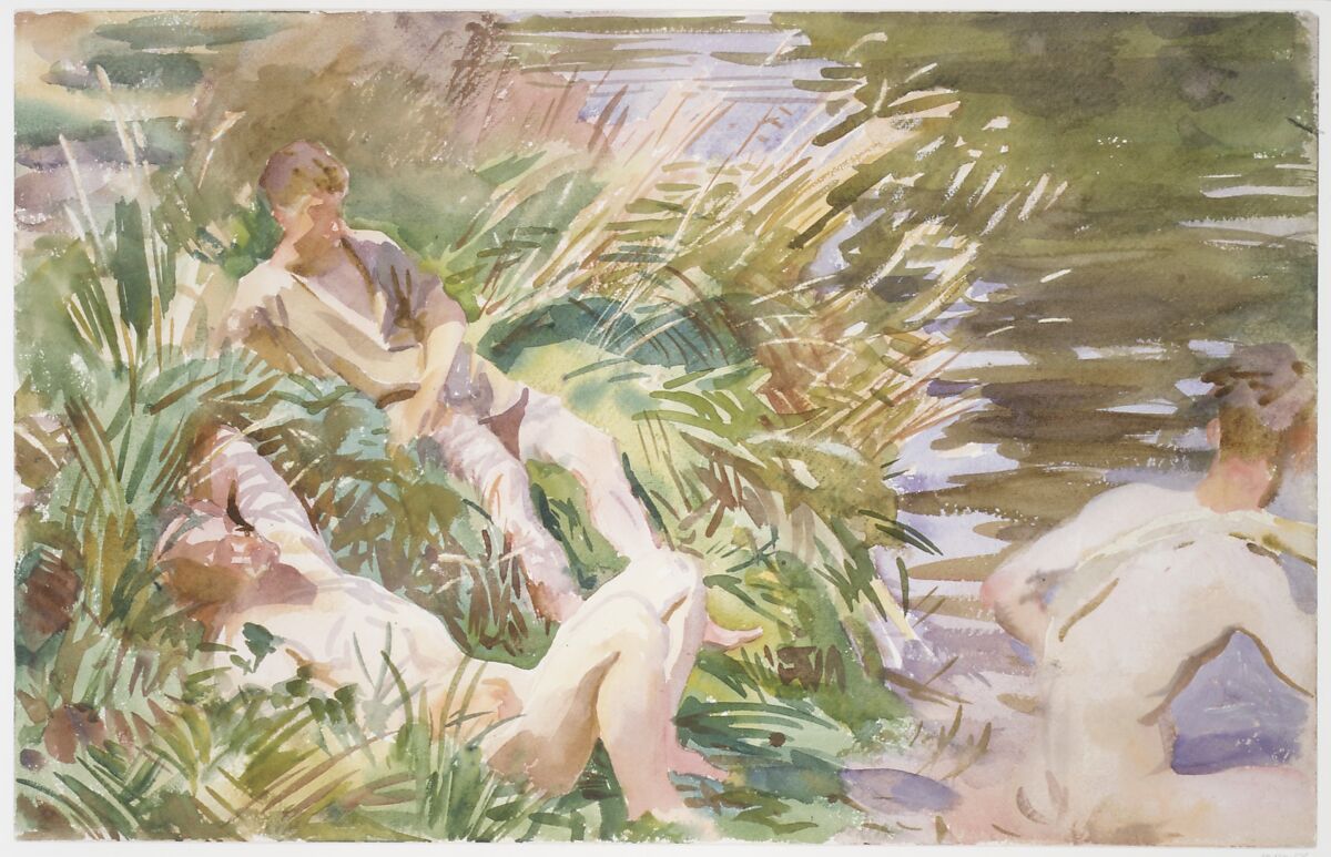 In 1918, Sargent received a commission from the British government for a monumental painting commemorating the joint efforts of American and British troops during World War I. That summer, he traveled to the western front in the valley of the Somme in search of a subject. He painted a number of informal watercolors, including these sketches of British soldiers bathing.