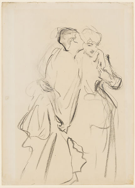A prolific and successful painter in oil and watercolor, Sargent seems to have sketched almost incessantly. He made rapid studies, such as this one, in preparation for his paintings or simply as impressions of his surroundings. Sargent captures a candid moment between Virginie Gautreau (1859–1915), at left, and an unidentified companion. He eschews detailed anatomical study in order to record their fleeting poses and gestures.