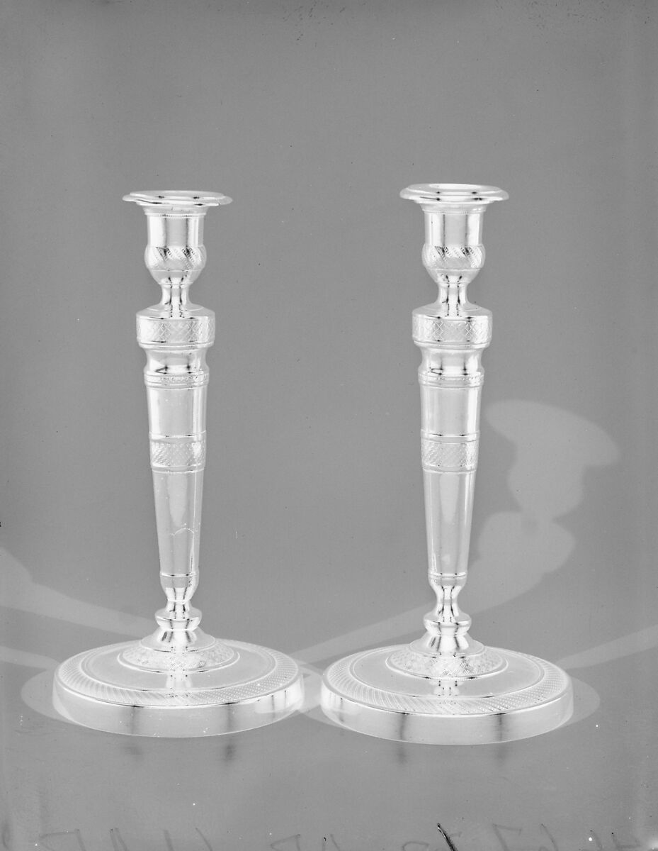 Rarely bearing dates or maker's marks, brass candlesticks can be dated with some accuracy by comparison to similar pieces of silver, which is generally marked. Brassmakers copied forms from silver. The present example came fitted with oil burners of later date. These have since been deaccessioned.