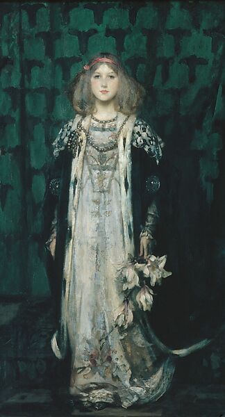 This painting shows the London-based artist’s daughter holding a sprig of magnolia blossoms, which in Victorian literature were often a sign of a character’s love of nature. The costume and the stylized fleur-de-lis motifs that decorate the green backdrop suggest a somewhat contrived presentation of the girl as a “dress-up” princess. The artist’s only child and one of his favorite models, Kitty Shannon (1887–1974) appears in many of his paintings. She later wrote several books, including an autobiography, published in 1933.