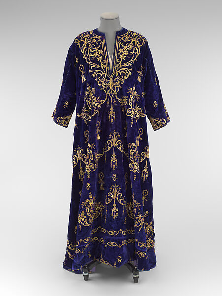 This bindalli (bindallı in Turkish) dress, said to be from Ankara, is made of a deep purple velvet with a delicate embroidered design in a finely executed dival style using metal-wrapped threads and small metal sequins. Bindalli dresses, worn for weddings and important occasions by Jewish and Muslim women, were expensive garments and would have been used repeatedly and passed down, which may account for the rather worn condition of this garment. The dress is constructed in a typical style for bindalli dresses with a round neck, front opening, dropped shoulders and straight sleeves. The gold embroidery decorates the bodice with an all over design of floral arabesques. The long full skirt is ornamented with three registers of an elaborate floral garland and small, filler motifs of tasseled wreaths and scrolls. A narrow running garland edges the hem of the dress.