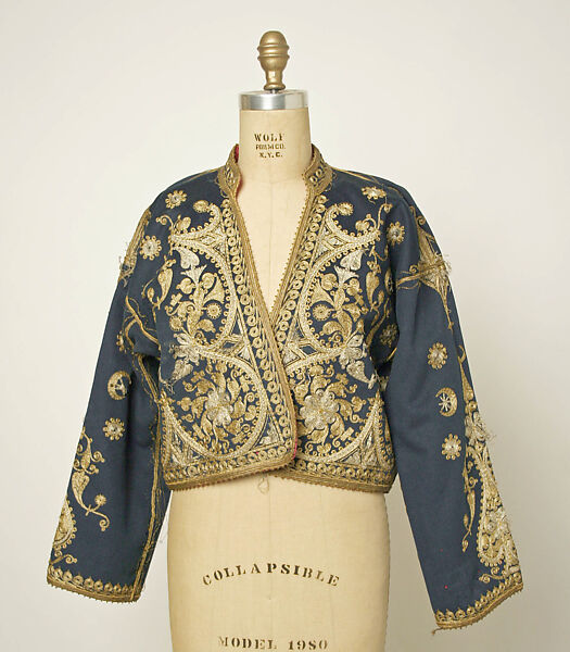 This short jacket, called a cepken, is an example of a wardrobe staple for Ottoman women of different classes and ethnicities in the eighteenth century. Worn by both rural and urban women, the cepken was generally made of wool or velvet, although other fabrics were sometimes used. The cepken could be decorated with embroidery or other kinds of trim, and sometimes had matching şalvar (baggy trousers). While the general shape of the garment has remained the same over time, the details of fabric and decoration changed to reflect current taste. This example is made of blue wool and is heavily decorated with an elaborate design executed in the laid cord technique. The standup collar, front opening, hem, and sleeves are all edged with a thick gold braid. The laid cord embellishment creates a look similar to the garments elaborately embroidered with gold metal-wrapped thread of earlier times, but with a modern, less labor-intensive mode of execution. According to information provided by the donor, the cepken was worn by her Muslim great grandmother from the Elazığ region of eastern Anatolia when she was married, ca. 1900.