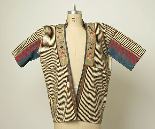The "signature style" of Syrian weavers combined fine weaving with intricate motifs and embellishments. Elite Bedouin men were among the key patrons of textile workshops and tailors in Aleppo and Damascus and commissioned meticulously designed damirs (coats), such as this one, for special occasions. The weaver created vibrant patterns using colorful silk and metal-wrapped thread that would have originally shone and sparkled. The motifs placed prominently on the upper back may have been considered to have protective significance for the wearer. This example is woven in narrow black and white stripes typical of examples worn by the Druze in the Hauran region from Bosra in southern Syria. Floral striped pattern bands on the wearer’s chest part vary the design of this example, while a standing collar of black cloth with luxurious trimmed braid in gold and red adds to this garment’s lavishness.