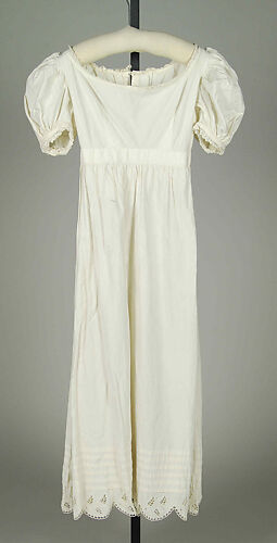 This underdress is poised between a period of classicism, with its columnar silhouette, and eclectic romanticism, with its burgeoning skirt forms. Made of plain white cotton with an applied hem of broderie anglaise, the dress has been trimmed with fine self-piping along the seamlines of its bodice. Originally catalogued as a finished dress because of its fully constructed sleeves and the fineness of its detailed workmanship, it was more likely intended to be worn under another dress of some transparency.