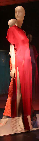 Several Mme Grès gowns from the mid-1960s are among the earliest couture examples to survive a flood in Mrs. Kempner's storage area. While her Mme Grès pleated dresses are well-established classics, Mrs. Kempner also collected subtler manifestations of the designer's conceptual dressmaking. A burgundy and red-orange silk crepe is constructed of two panels of fabric, pieced and seamed vertically into a toga-like gown. The gown represents the designer's interest, which began in the late 1930s, in North African costume traditions and the minimally shaped pattern piece.