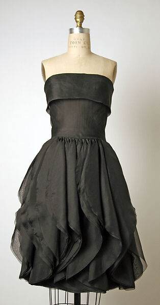 Short, black cocktail and evening ensembles were staples of Mrs. Kempner's wardrobe. An exception is a cocktail dress by Pierre Cardin, one of the few examples of Mrs. Kempner's couture wardrobe from the 1960s to survive the flood in her storeroom. With its skirt of organza roundels, the dress, though clearly of its time, also manifests in nascent form Cardin's evolving interest in geometry. As an example of couture, it attests to Mrs. Kempner's design acuity.