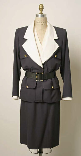 Mrs. Kempner's closets yielded a seemingly endless array of tailored suits. Many of the designs incorporated sartorial variations on iconic menswear elements: the spencer, the "Eisenhower" or blouson jacket, the double-breasted "gangster" suit, and the formal blazer. While acknowledging the virtues of traditional menswear, Mrs. Kempner was also an advocate of innovations of cut and detailing in her tailoring. The virtuosity of Balmain's jacket lapel incorporated into a seam to create a trompe l'oeil waistcoat or Saint Laurent's nautical ensemble that supplants a naval uniform's white duck with feminine cotton piqué suggests her interest in witty and novel details.