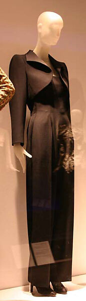 Mrs. Kempner's reliance on the suit as a staple of her daytime wardrobe extended into evening, especially Yves Saint Laurent's tuxedo-inspired "Le Smoking." Although Saint Laurent's first smoking of 1965 was an almost literal transposition of the components of a man's tuxedo to a woman's body, he soon created versions with skirts, both short and long, and as long coatdresses and jumpsuits. In this ensemble, Saint Laurent takes two recurring garment types of his oeuvre, the bolero jacket and the jumpsuit, and details them with the iconography of the tuxedo. When cut to caress the shape of a woman, traditional male forms are seductively freighted with a Helmut Newton-like androgyny.