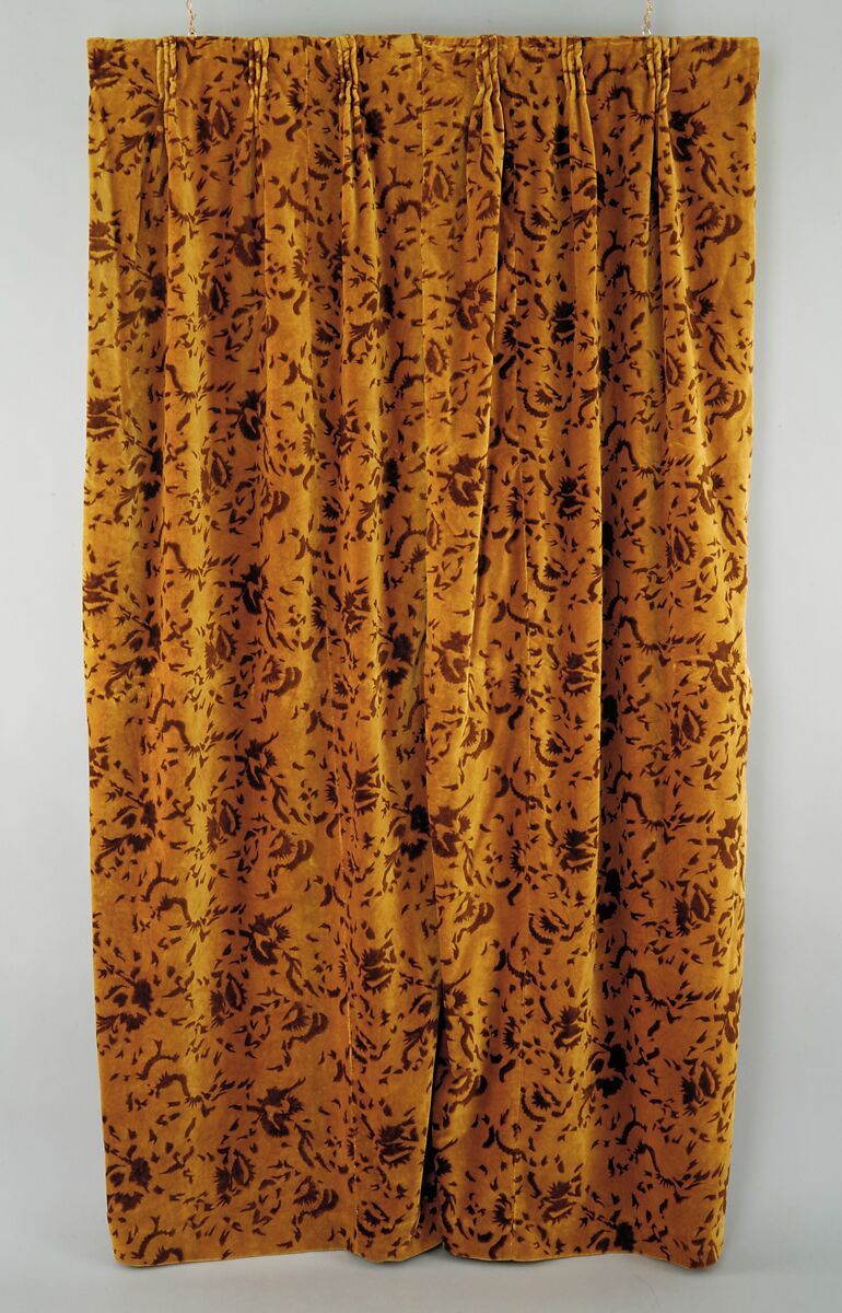 This fabric featuring scallop shells interlaced with seaweed is among the few patterns produced by textile designer Candace Wheeler’s firm, Associated Artists, that can be attributed to a specific artist. Ida F. Clark began her career as an embroiderer for Wheeler’s earlier partnership with Louis C. Tiffany but soon became one of the chief designers at Associated Artists. According to the press, she created "the more conventional designing done by the house." Clark reused the motif seen here, which was printed on both cotton velveteen and ribbed cotton, from the border of her 1881 prizewinning wallpaper design.