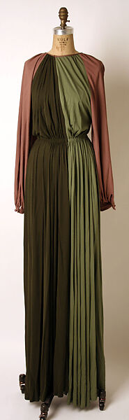 Although Mrs. Kempner's collection primarily comprises items from a handful of couture houses, she was just as likely to find favorite pieces by designers of radically different styles and temperaments. A gown by James Galanos is among a number from this designer to have survived in varying states of conservation. In his generation, Galanos alone could challenge the mastery of the French haute couture. Favored by his clients for his extraordinary tailoring, Galanos also developed a reputation as the master of softly draped eveningwear. Silk jersey and silk chiffon, among the hardest materials to manipulate, were signature elements of his style. The subtlety of his approach is seen in the beautifully worked, asymmetrically disposed panels of his jersey gown.