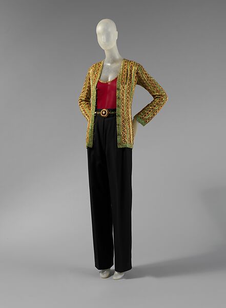 Although heavily beaded silk jersey bodices from the late 19th century survive in The Costume Institute collection, the earliest couture manifestation of the cardigan for evening is generally ascribed to Mainbocher's beaded sweater sets of the early 1946s. His design was a response to the chilly rooms that were a consequence of the fuel rationing of the war years. Saint Laurent's "cardigan" is in fact not a sweater, but rather a trompe l'oeil tour de force of the embroiderer's art. Beaded to suggest the motives and ribbing of a fair isle patterned cardigan, the untailored jacket is worn over an informal evening pant ensemble.