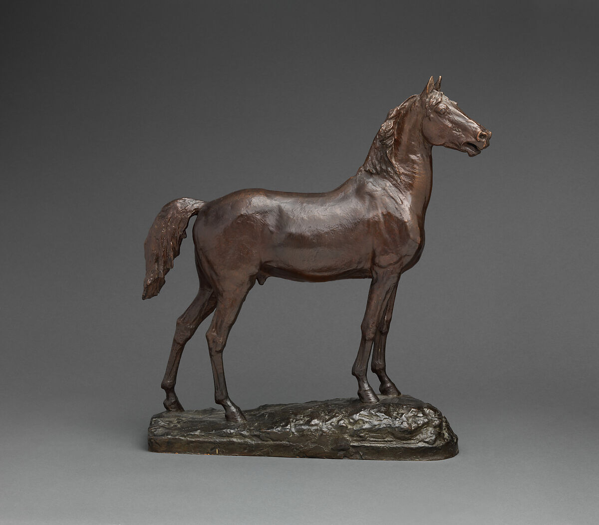 This statuette was cast after a preliminary model for the horse in Ward's bronze equestrian statue of Major General George Henry Thomas (1816–1870), a Union officer during the Civil War. The monument was commissioned in 1874 by the Society of the Army of the Cumberland and unveiled in 1879; it stands in Thomas Circle at the intersections of Massachusetts and Vermont Avenues and 14th and M Streets in Washington, D.C. In Ward’s preliminary concept, illustrated in the Metropolitan’s bronze, the horse is posed so that the forequarters are elevated on the gentle incline of the base. The tail and mane are more windblown in the monumental bronze, but the two versions share the animated posture of the head. This realistic steed revolutionized American equestrian sculpture, turning it away from antique precedents toward more naturalistic, dynamic representations.