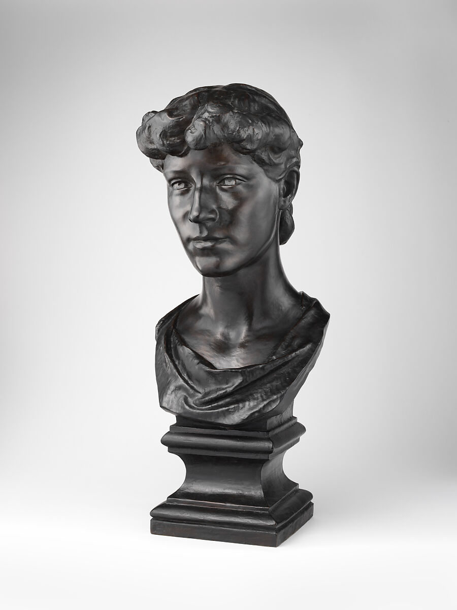 In 1886, Warner married Sylvia (née Sylvie) Françoise Martinache (1858–1949) in New York. She was educated at schools in France and New York, including the Normal School (now Hunter College). As an aspiring art teacher, she studied at the Cooper Union where in 1878 she won a second prize in a drawing class that concentrated on copying antiquities taught by Warner’s friend Wyatt Eaton. Warner’s devotion to his wife is reflected in this sensitive portrait he modeled during the first few months of marriage. Sylvie Warner’s head is positioned frontally, with incised pupils gazing forward. Her fine features, including a straight nose, delicate lips, and long, graceful neck attest to her elegant beauty. The sculptor opted for an irregular termination on the front and sides of the bust that complements the gentle, sweeping folds of fabric around the sitter’s shoulders. This bust was one of eleven works by Warner given to the museum by the National Sculpture Society after the sculptor’s untimely death in 1896; the bronzes were cast by Tiffany and Company from his original plasters.