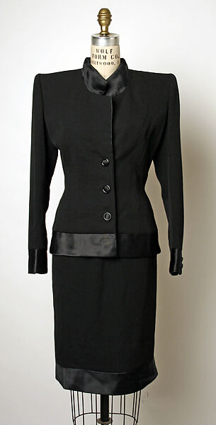 Mrs. Kempner favored certain styles and would acquire them with less regard to their provenance than their usefulness. The sharply tailored cocktail suit is not typical of the designs she generally sought from her couturier friend, Valentino. Typically, Mrs. Kempner's Valentinoes include vividly colored day suits, prettily patterned dresses, glittering evening jackets and fluttering gowns. This short evening ensemble, which combines the ease of a suit with details appropriate for semi-formal evening events is, for all its chic, an especially utilitarian expression for the designer. The jacket's bow-trimmed back, however, is an assertion of Valentino's signature prettiness.