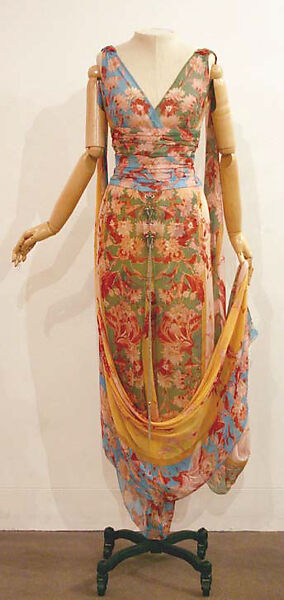 Since garments with patterning or complex ornamentation are less easily combined into new ensembles than those of plain cloth and neutral color, much of Mrs. Kempner's collection is of solid hued fabrics. Her love of high-key effects, however, made for a substantial number of exceptions to this approach. Photographs of her in the 1960s are as likely to show her in a psychedelic print Pucci gown as in a Saint Laurent "smoking." Her love of prints veered toward the unabashedly feminine, as in a chiffon gown by Valentino. The designer has draped a panel-printed fabric into a masterwork of construction. Both the overskirt and long trained underskirt are uncut lengths of border-printed panels. Valentino creates a deceptively supple effect while preserving the aesthetic integrity of his costly materials.